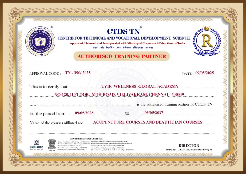 UYIR WELLNESS GLOBAL ACADEMY is an Authorised Training Partner with CTDS TN ( Centre for Technical and Vocational Development Science - An approved, Licensed and Incorporated with Ministry of Corporate Affairs, Govt. of India )